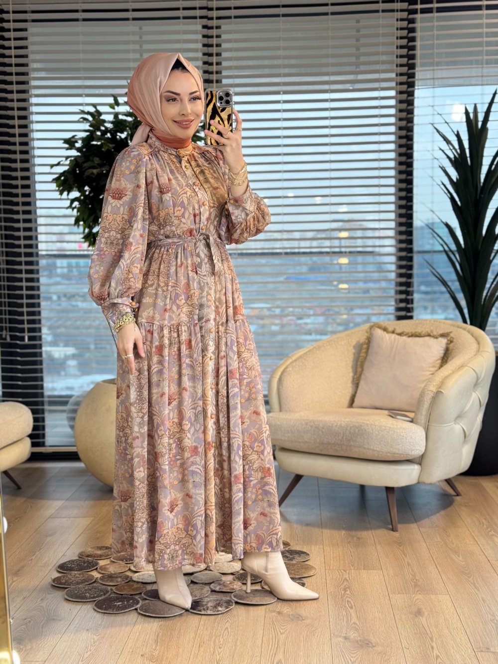 014 Şifon Üstü Karışık Çiçek Desen Elbise Hardal