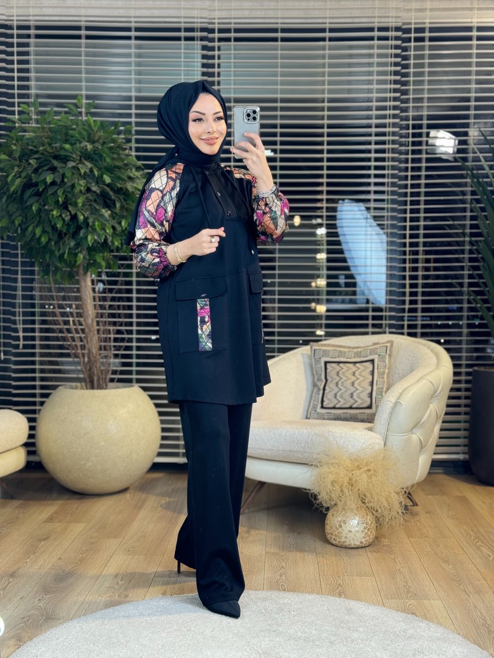 02-2221 Omuz Ve Kolları Kapitone Desenli Takım Siyah
