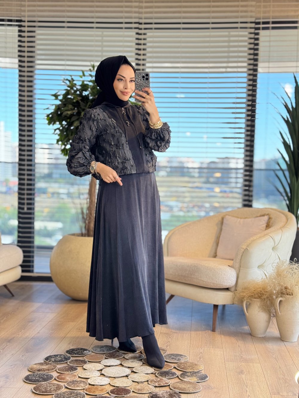 02-2648 Kabartma Desenli Kapşonlu Fermuarlı Takım Siyah