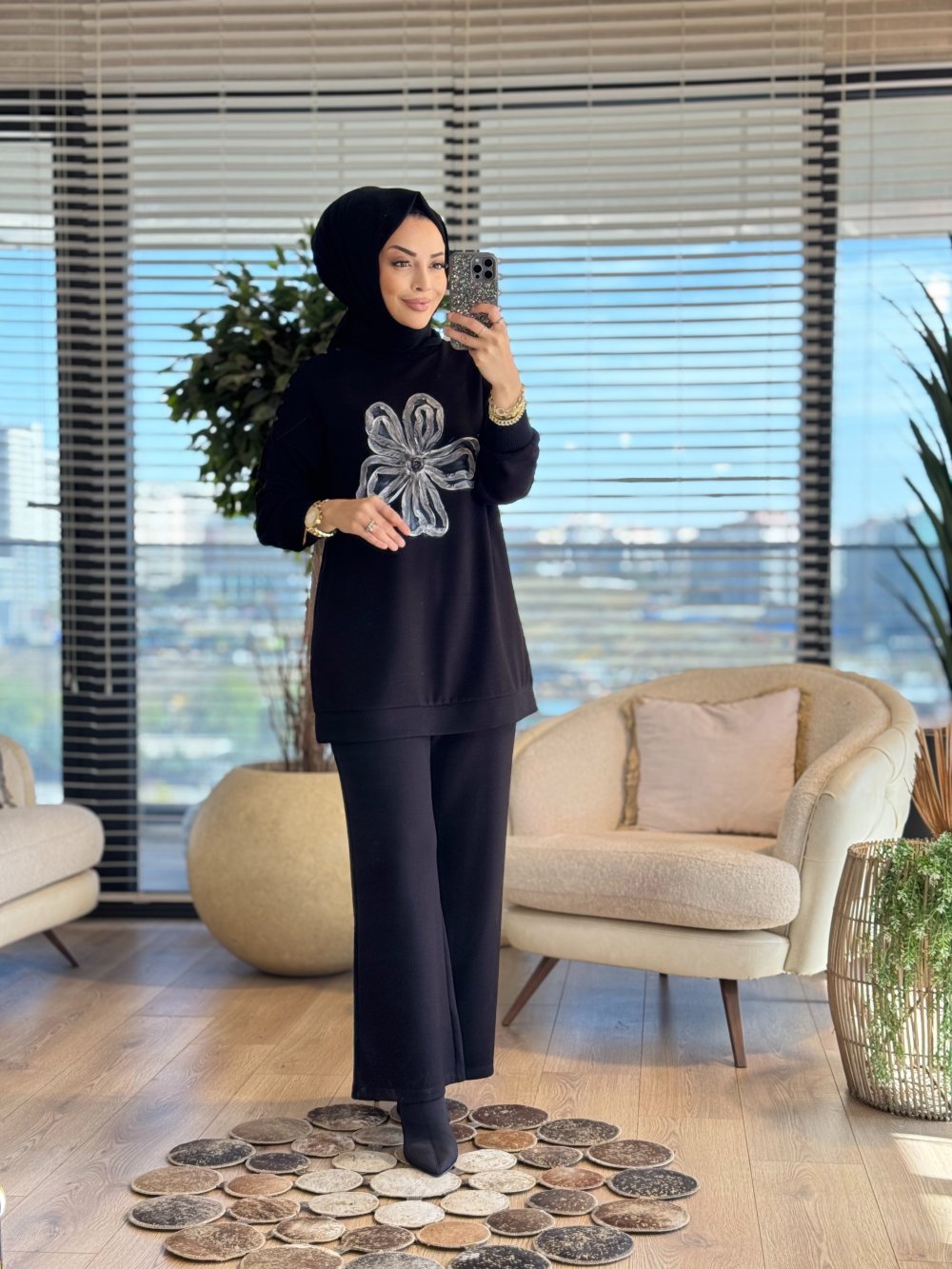 02-2698 Ön Büyük Çiçek Nakışlı Takım Siyah