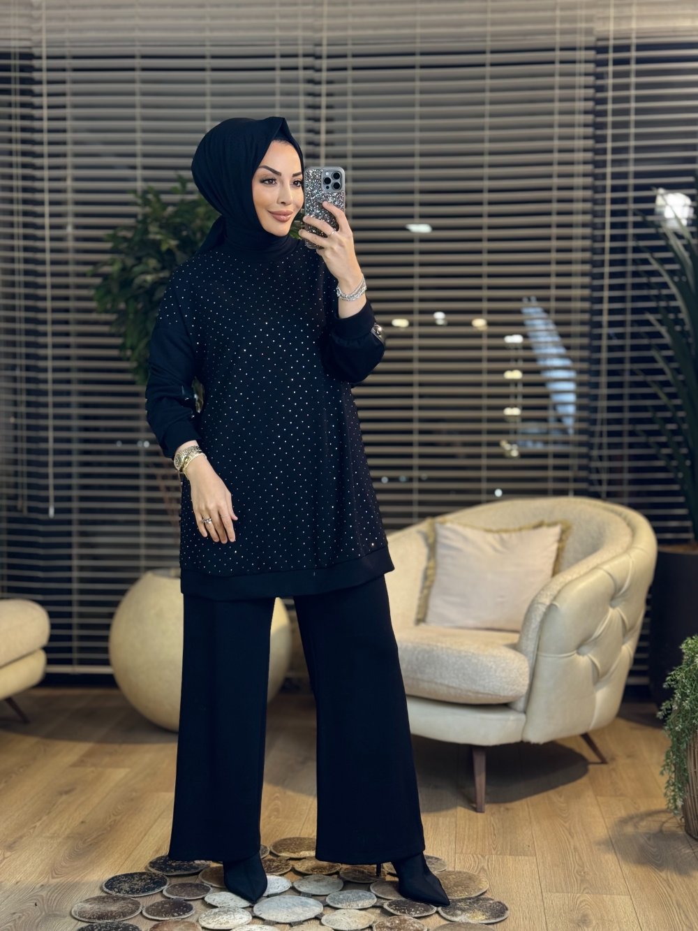 02-2727 Önü Serpme Taş Baskılı Takım Siyah
