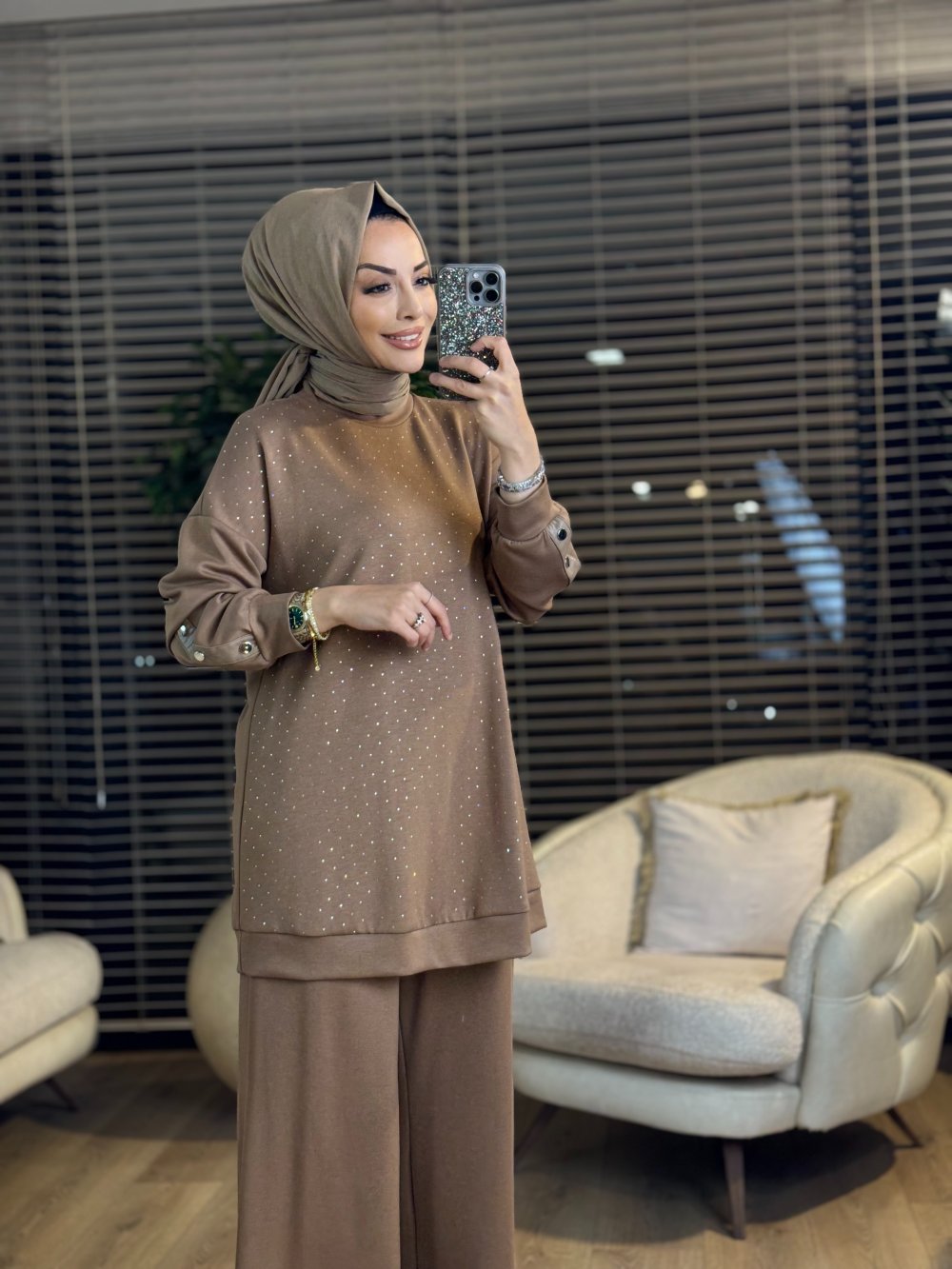 02-2727 Önü Serpme Taş Baskılı Takım Siyah