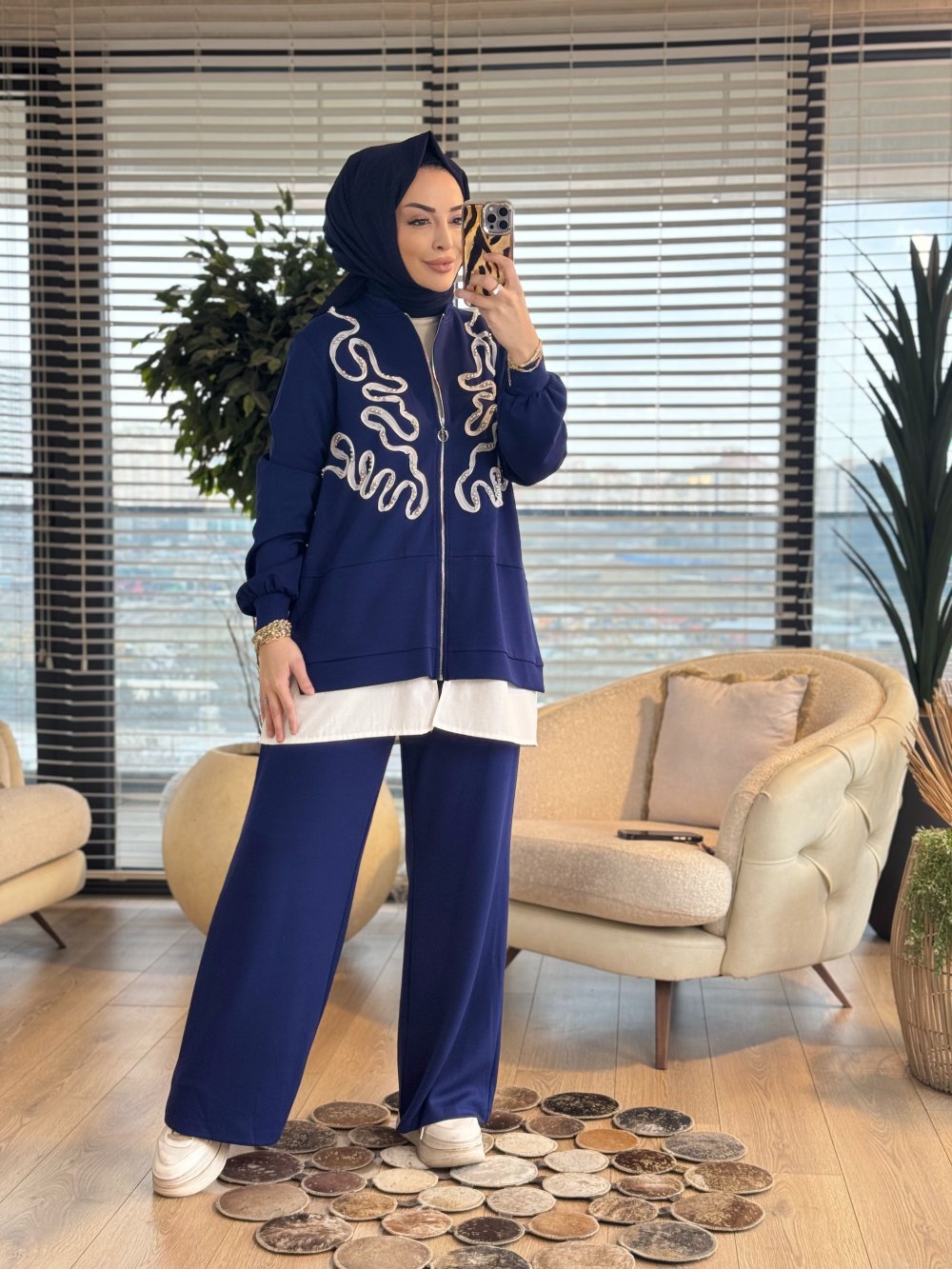 02-2807 Ön Kordon Üstü İncili Fermuarlı Takım Lacivert