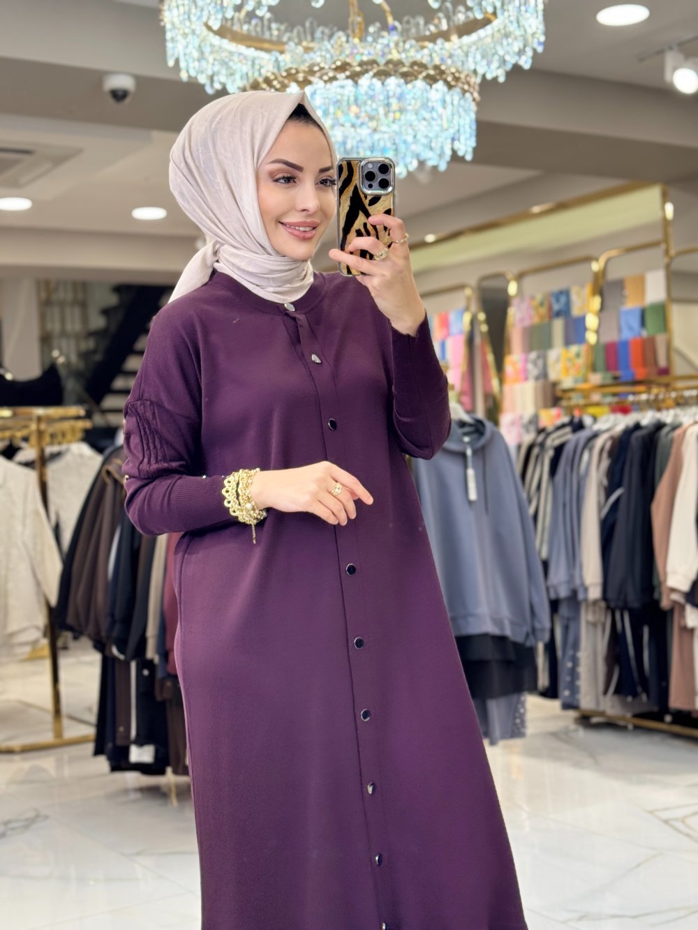 048 Eteği Volanlı Çıtçıtlı Uzun Hırka Mürdüm