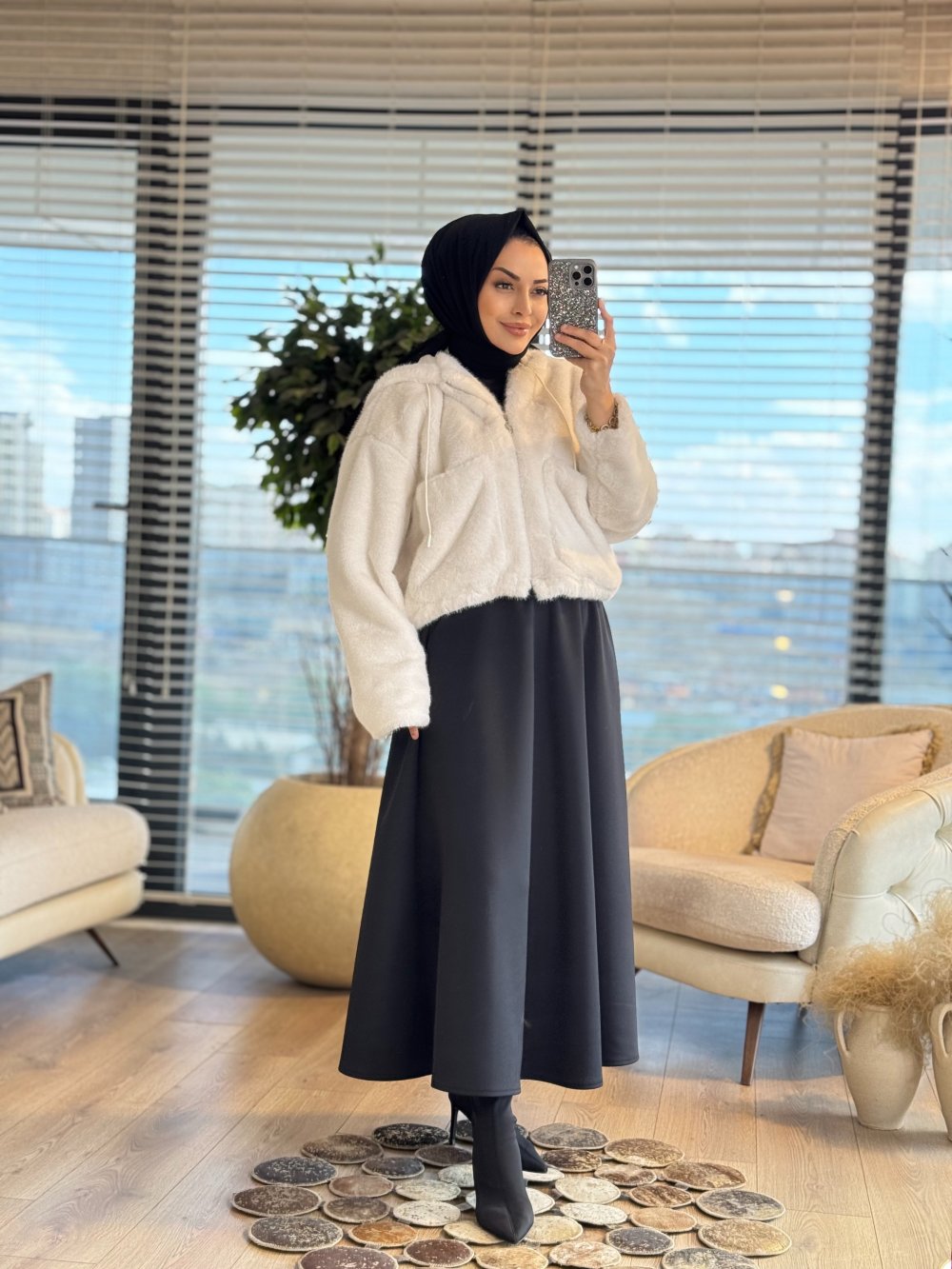 1005183 Kısa Kapşonlu Kürk Mont Ekru