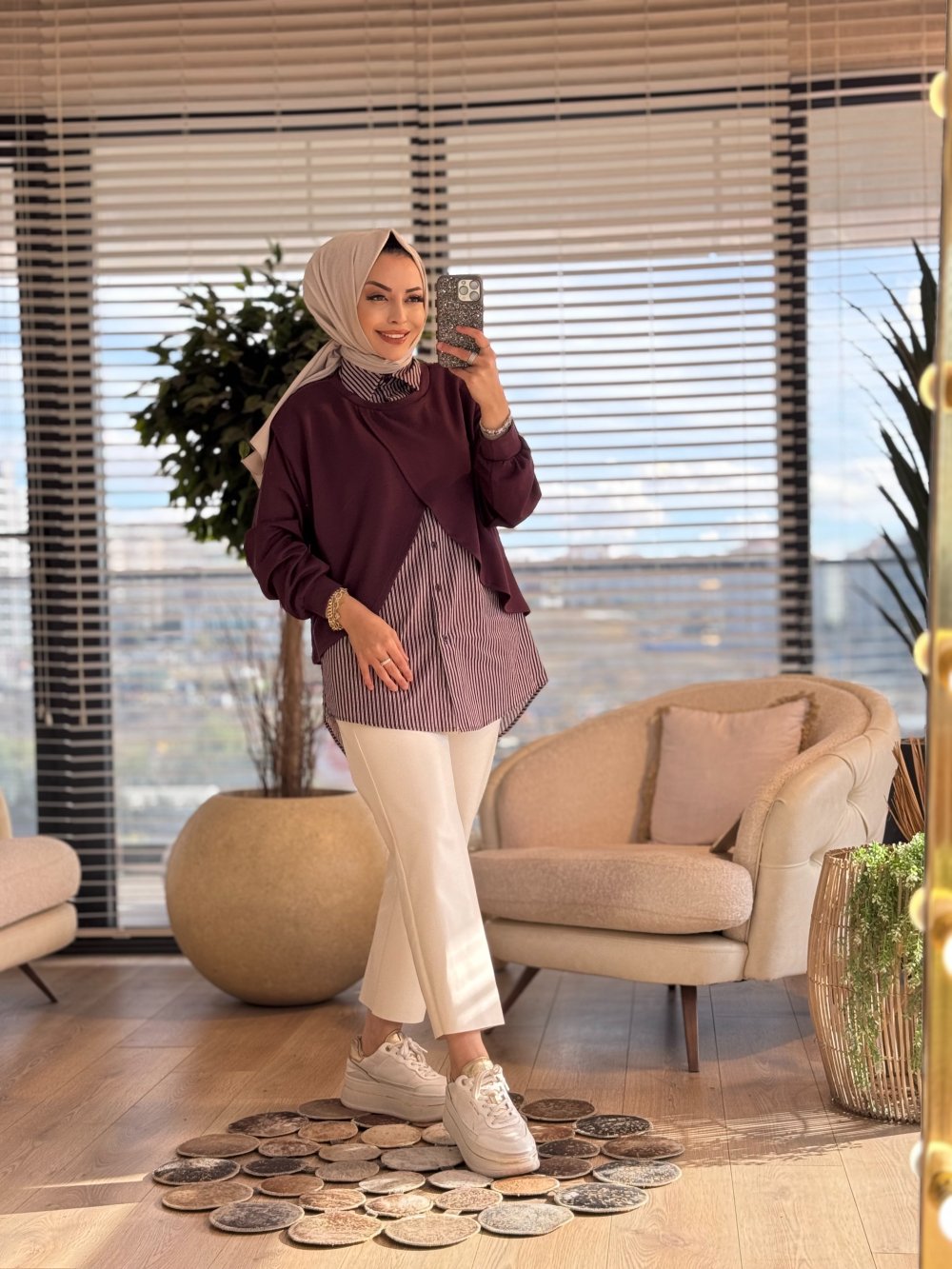 10725 Çizgili Gömlek Üstü Bluzlu Tunik Mürdüm