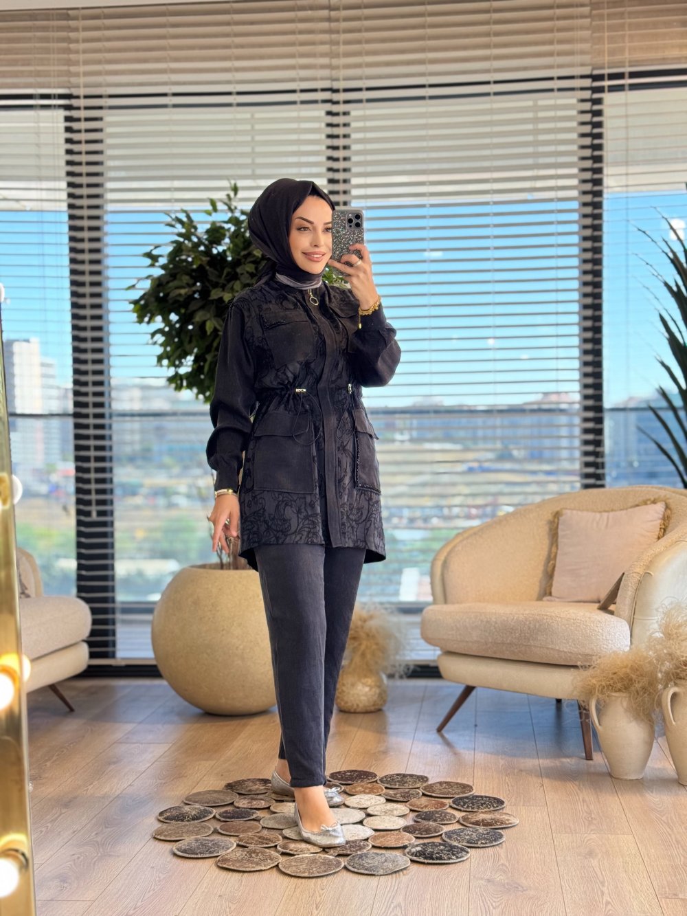 1204 Önü Kendinden Desenli Takım Siyah