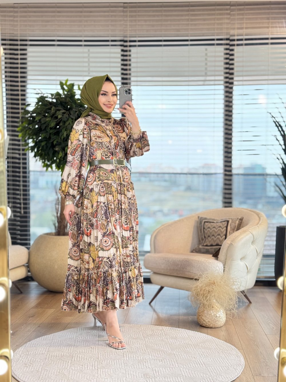 1243 Saten Desenli Eteği Fırfırlı Elbise Haki