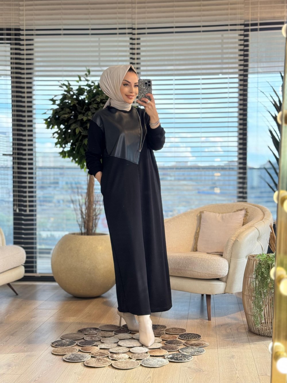 12656 Deri Parçalı Fermuar Detaylı Elbise Siyah