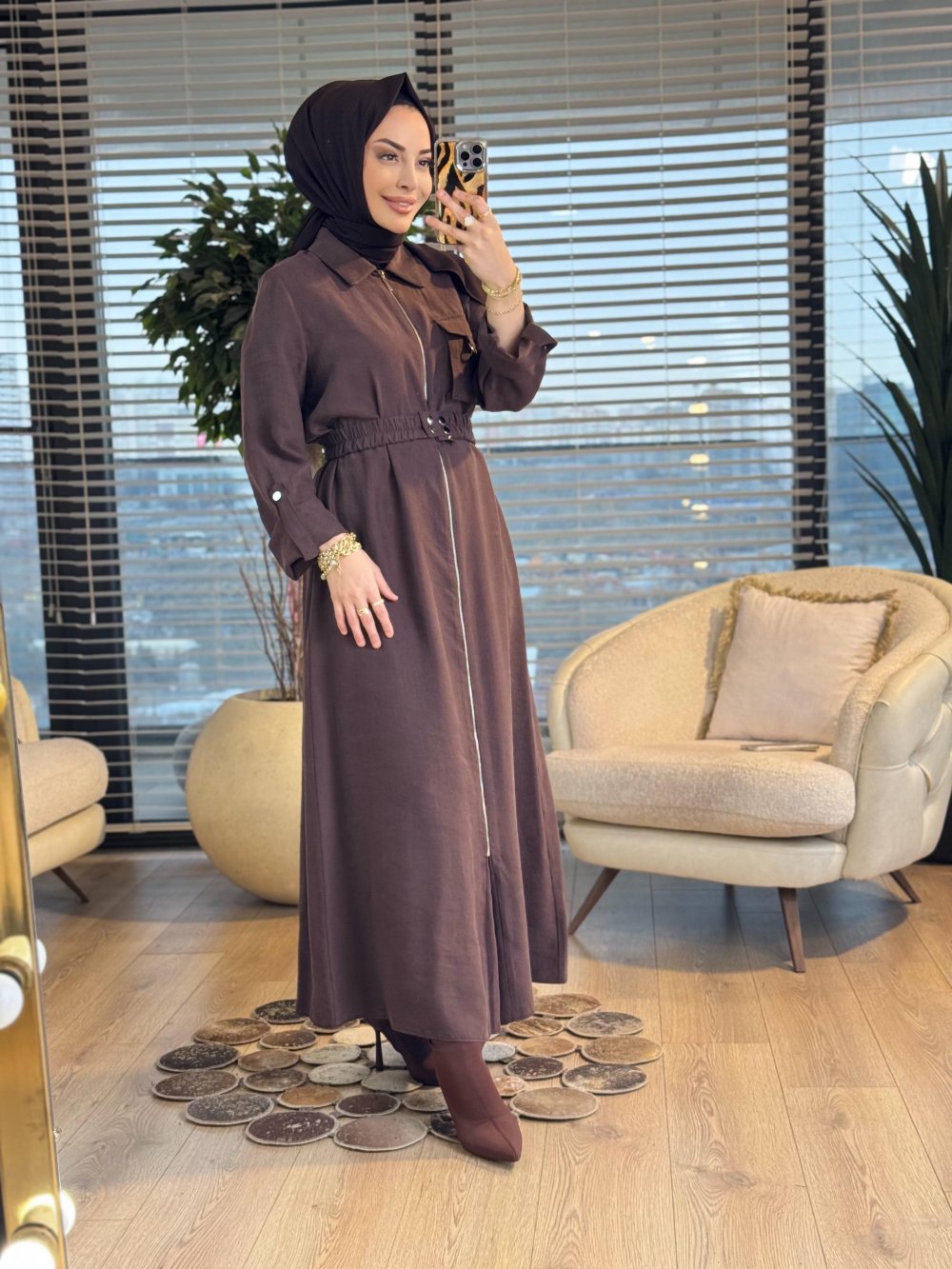 12667 Önü Fermuarlı Tek Cepli Elbise Kahve