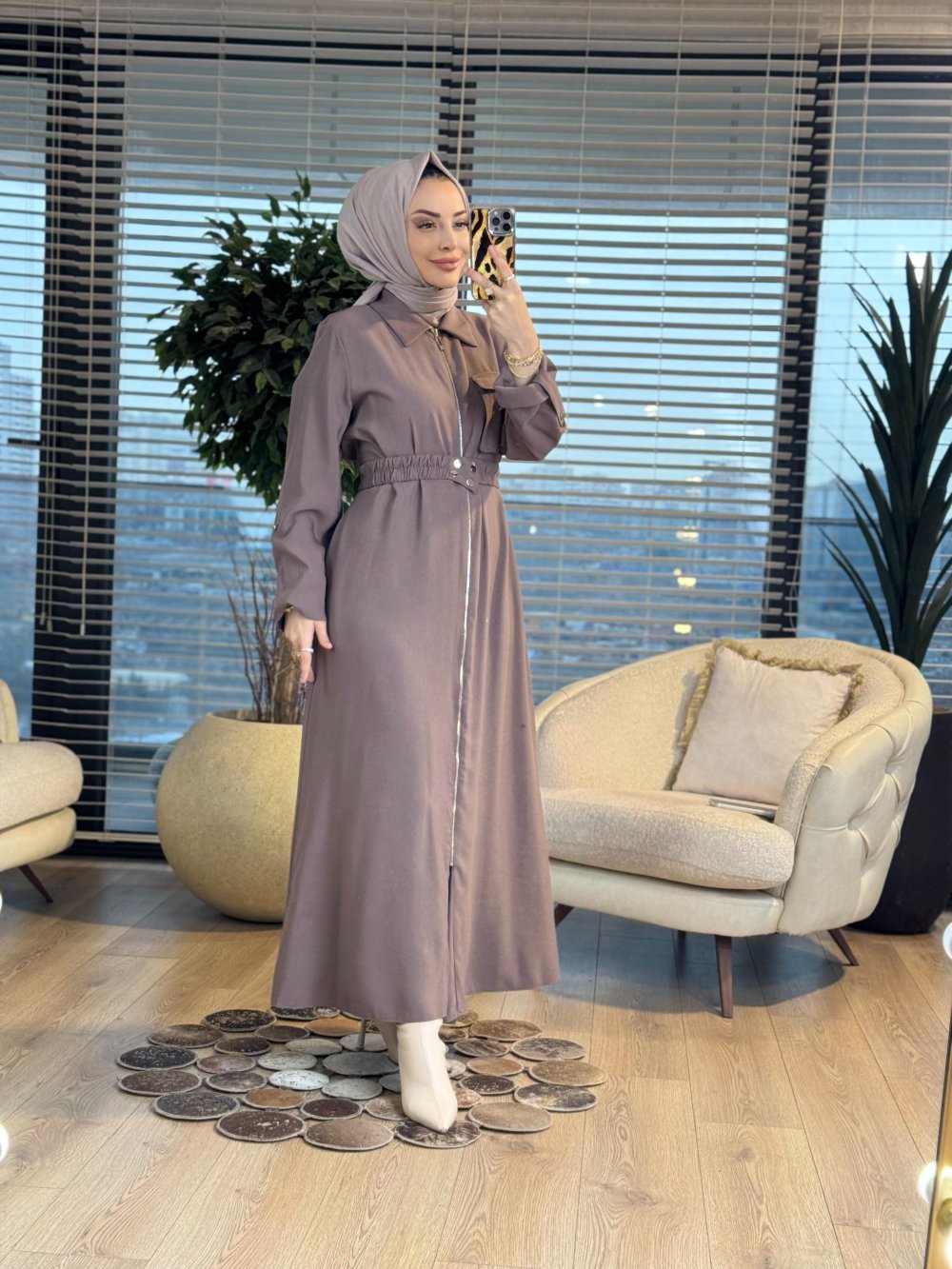 12667 Önü Fermuarlı Tek Cepli Elbise Vizon