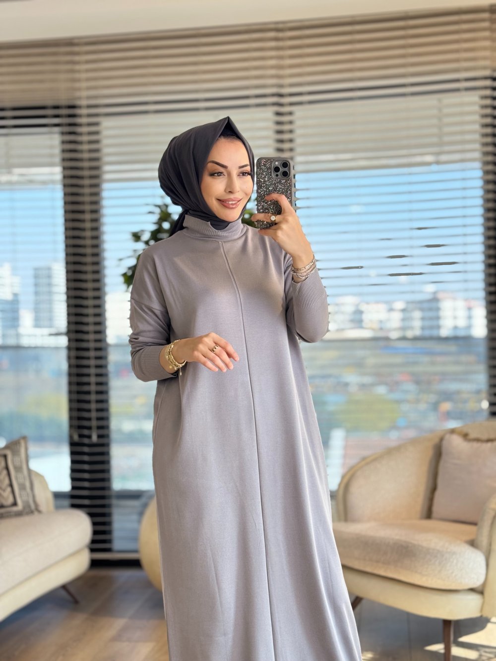 130 Önü Boyuna Çizgi Detaylı Triko Elbise Gri
