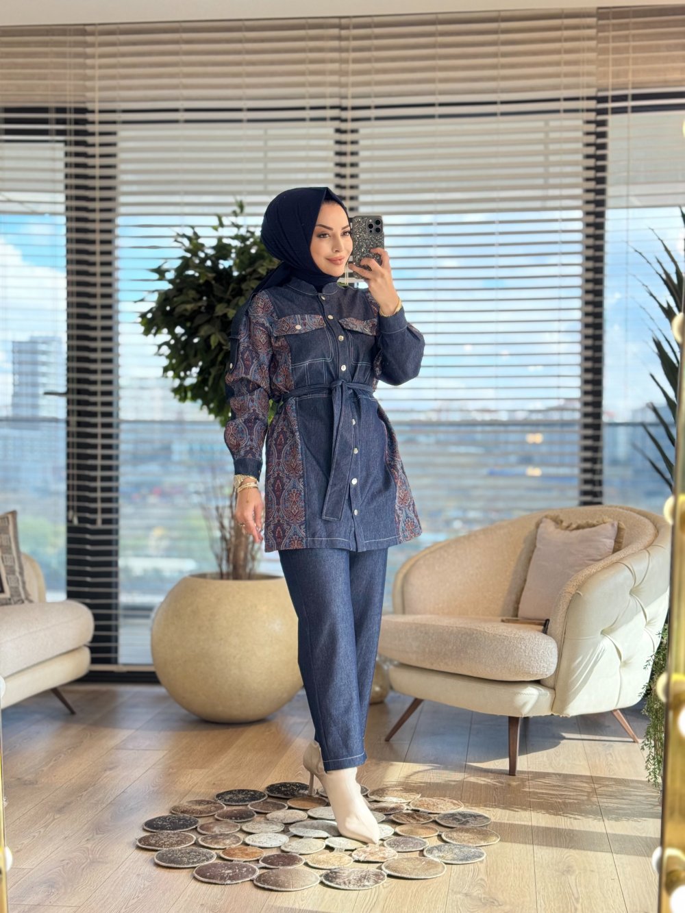 1397 Tencel Kol Ve Yanları Desenli Takım Lacivert Kırmızı