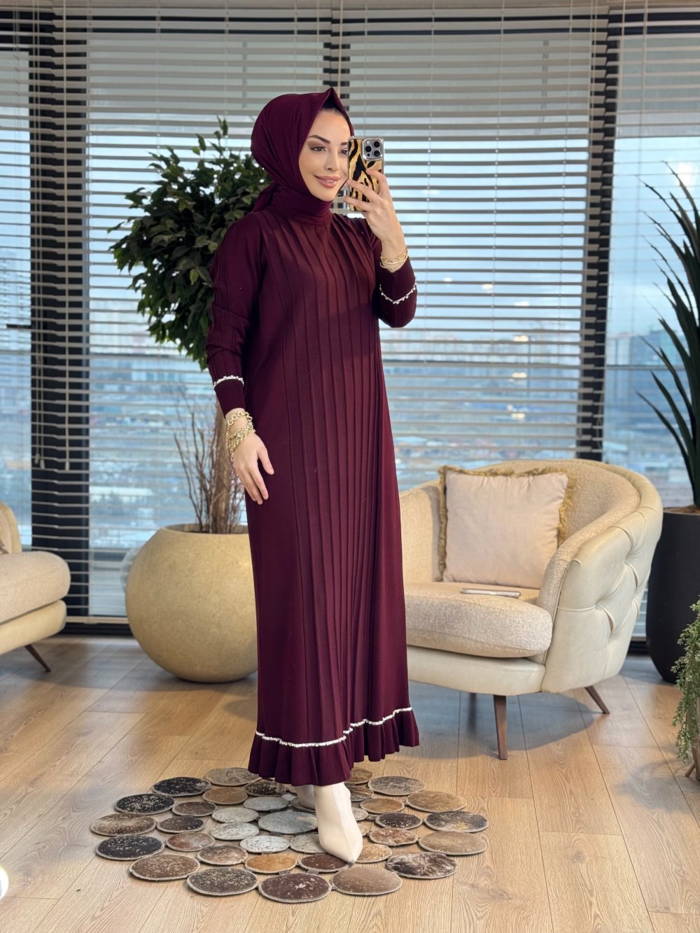 140 Etek Kol Ucu Sutaşlı Triko Elbise Bordo