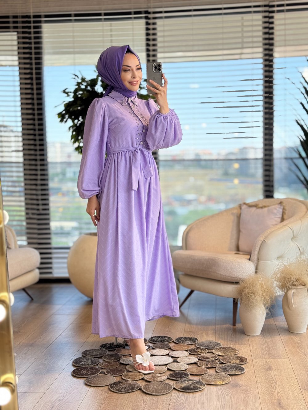 1412 Şifon Zikzak Desenli Patı Taşlı Elbise Lila