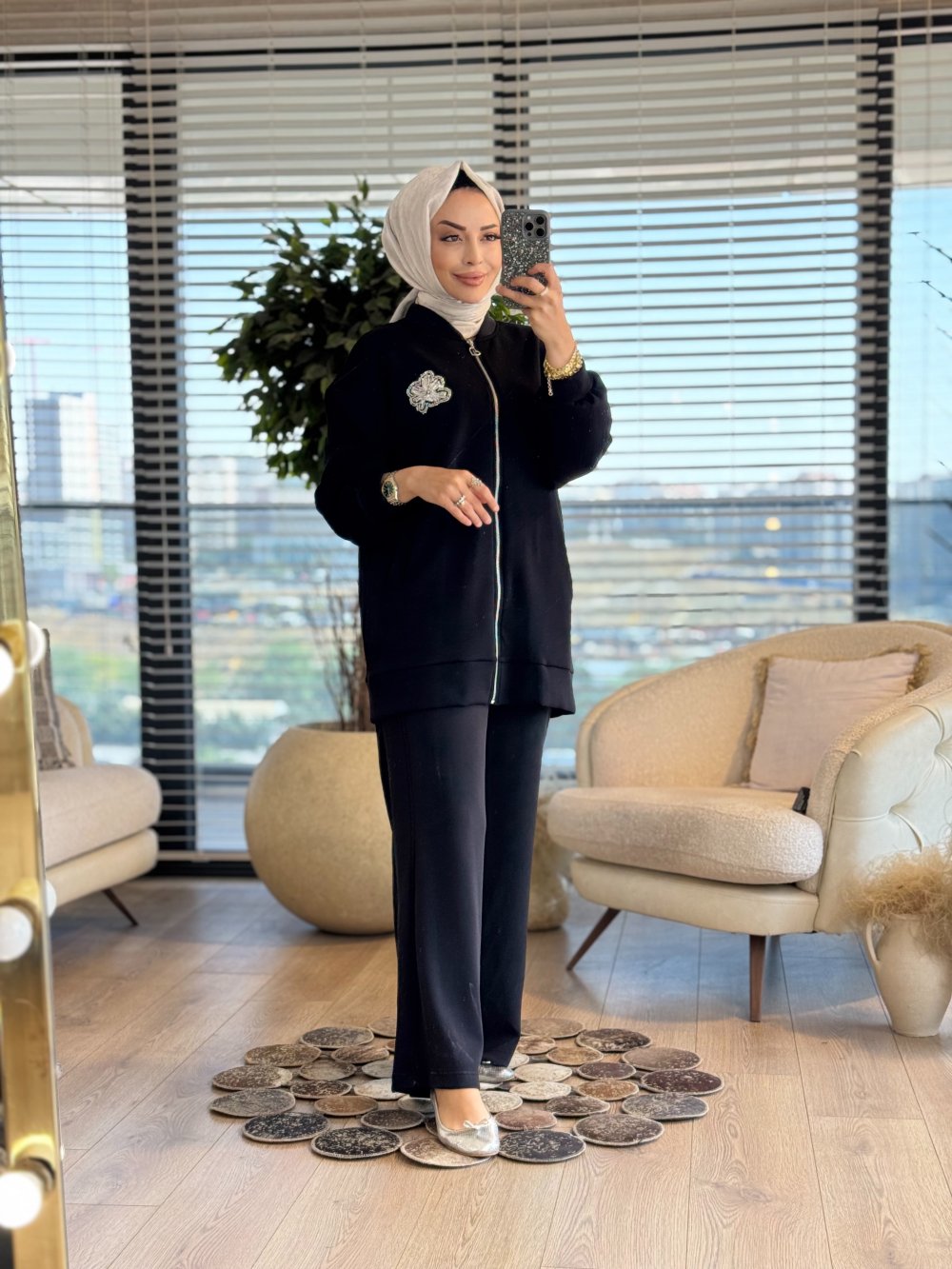14305 Çiçek Broşlu Fermuarlı Takım Siyah