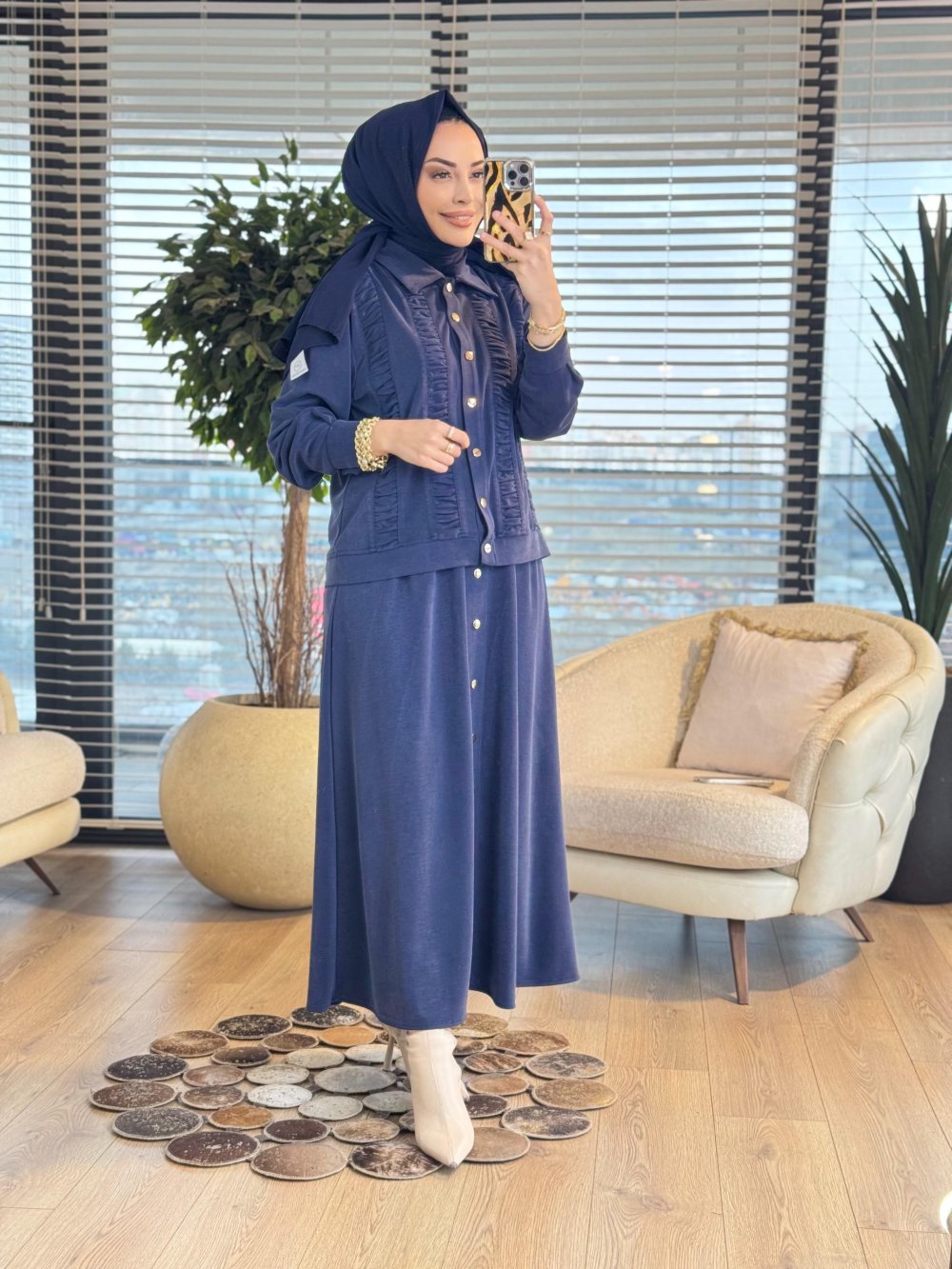 1438 Ön Büzgülü Etekli Takım İndigo