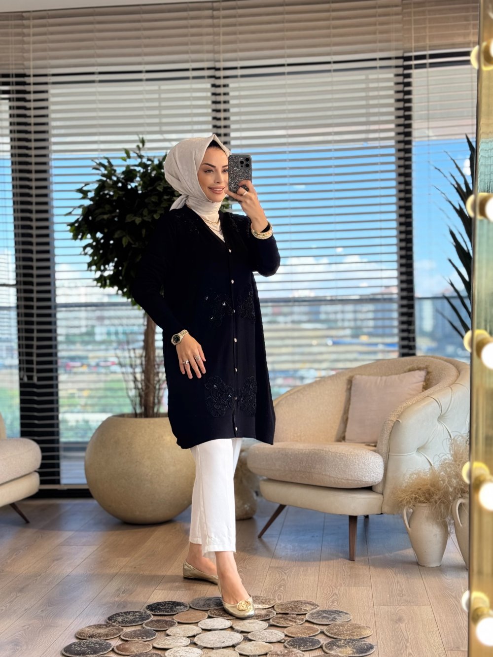 145111 Üçlü Çiçekli Uzun Hırka Siyah