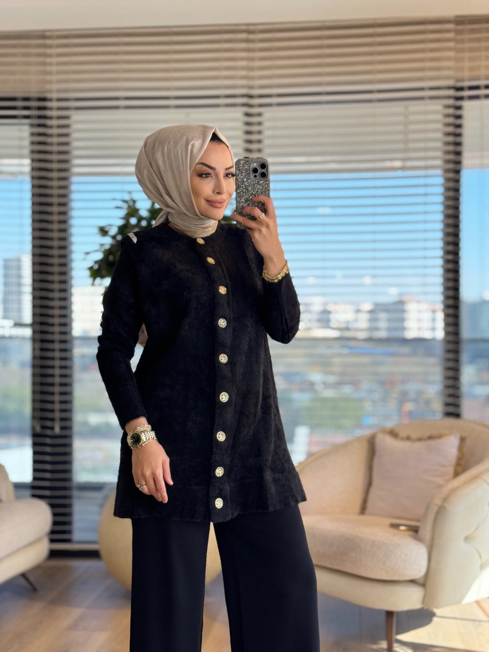 145402 Angora Omuzu Şık Taşlı Hırka Siyah