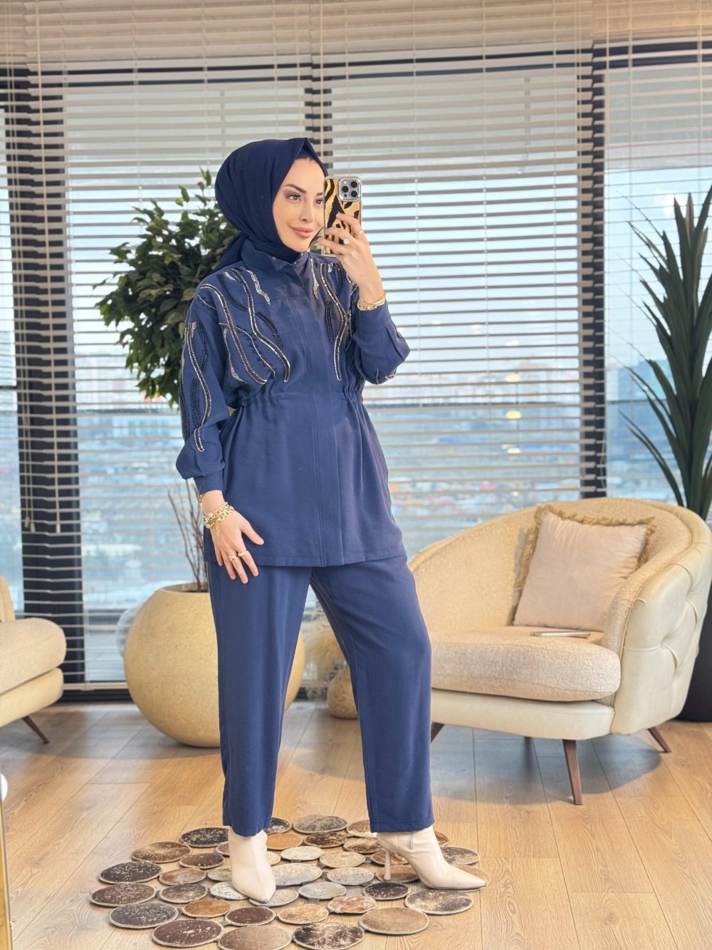 1465 Ön Kol Boncuk Taş İşleme Fermuarlı Takım Lacivert
