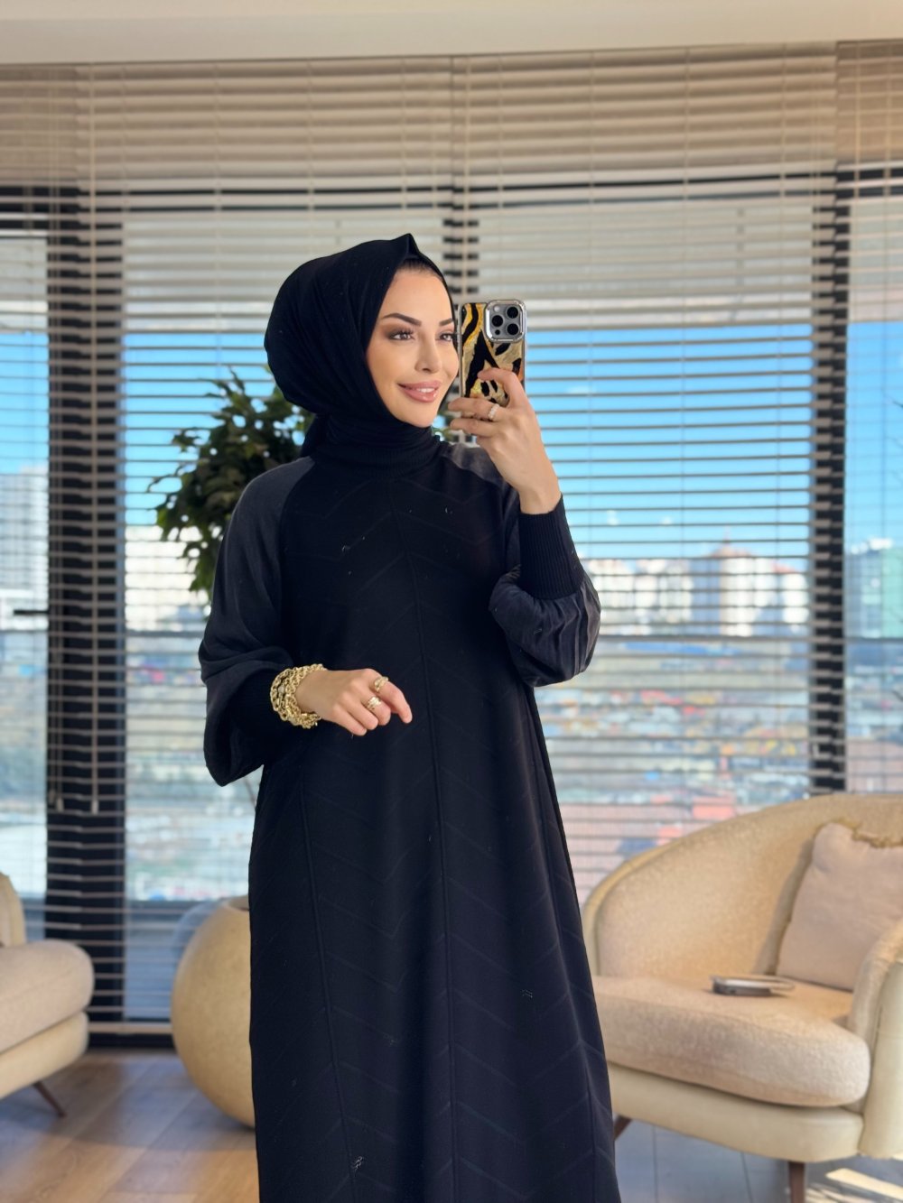 148 Ön V Dikişli Kolu Kumaş Triko Elbise Siyah