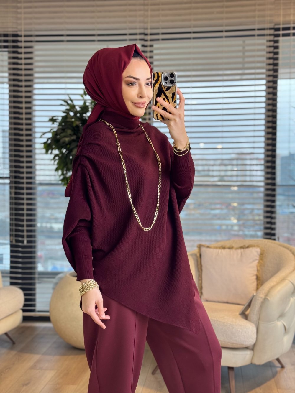 161 Asimetrik Omzu Drapeli Triko Tunik Bordo