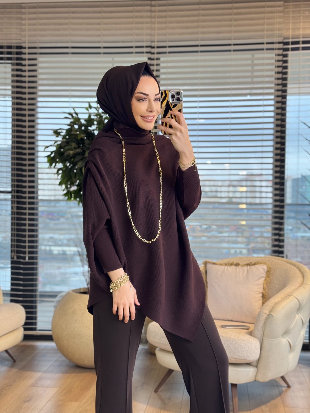161 Asimetrik Omzu Drapeli Triko Tunik Kahve