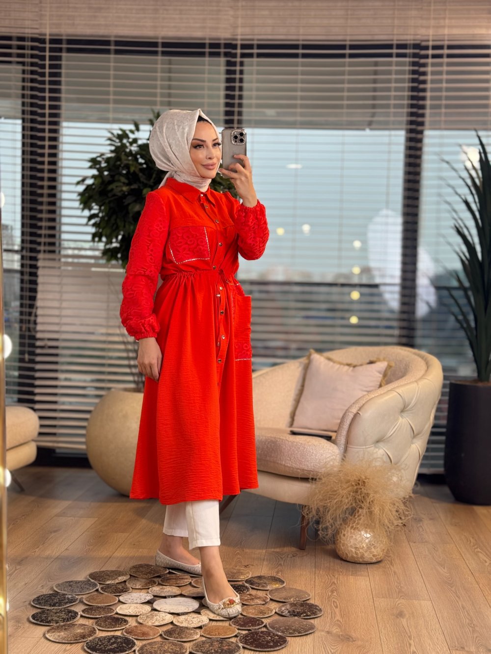 2003 Kol Ve Cebi Tül Üstü Kabartma Desenli Kap Mercan