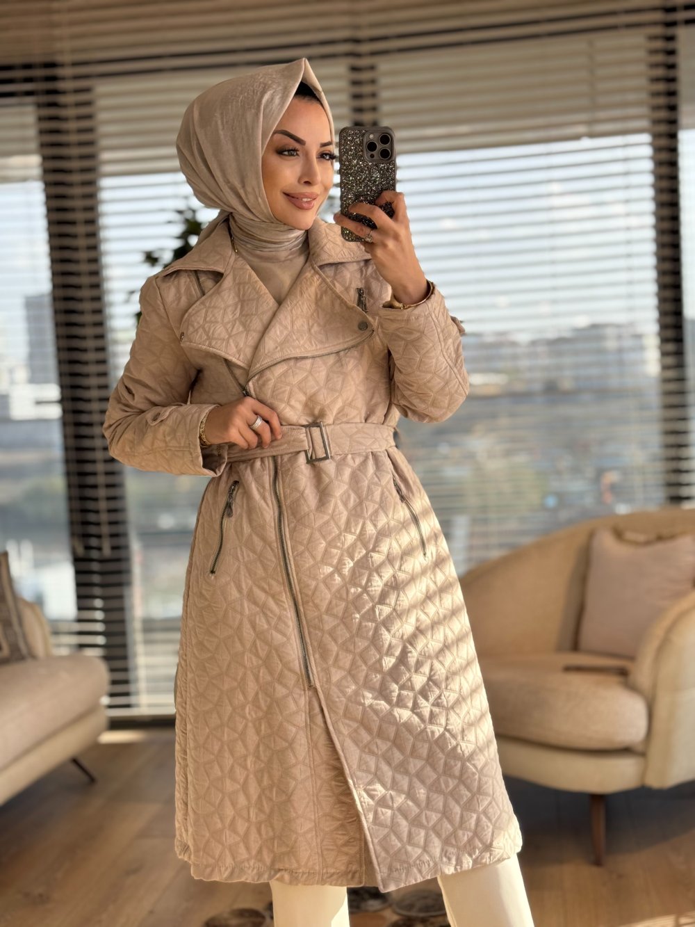 20212 Kendinden Desenli Fermuarlı Kaban Bej