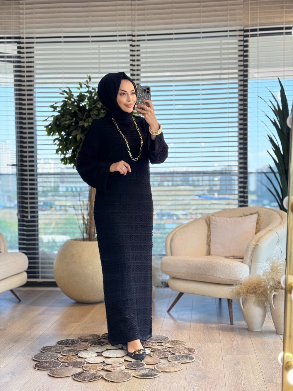 2027 Üç Sıra V Motif Örgülü Triko Elbise Siyah