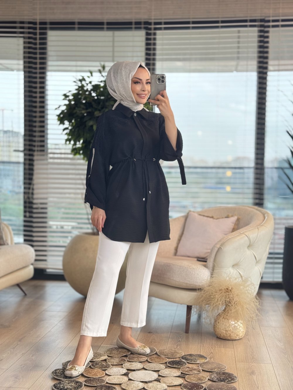 2043 Omuzu Tül Üstü Kabartma Desenli Kısa Kap Siyah