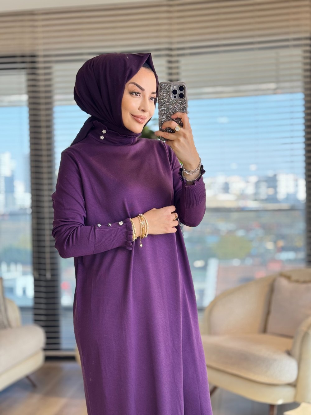 211 Yaka Manşet Fırfırlı Triko Elbise Mürdüm