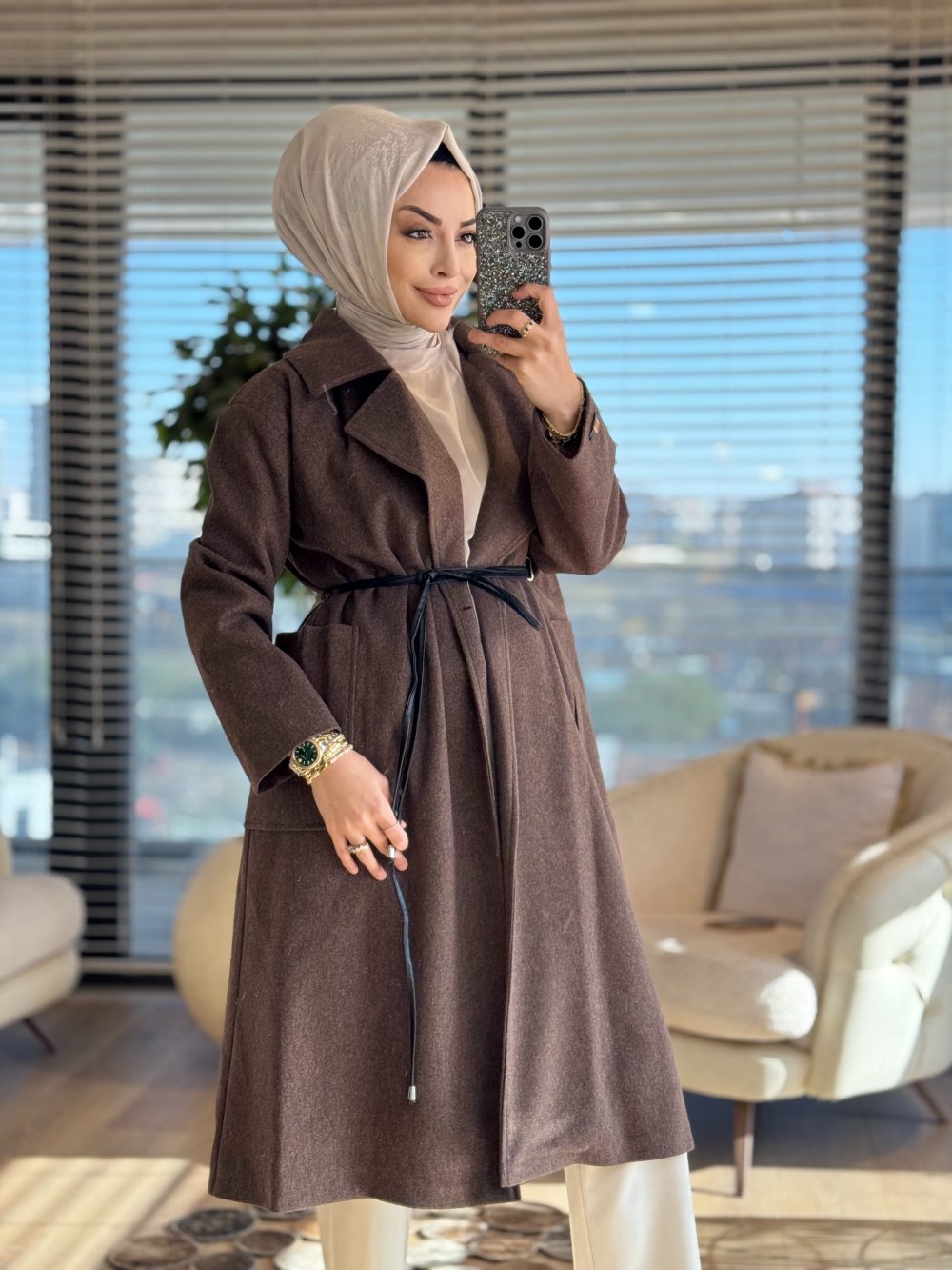 2189 Kaşe Deri Kemerli Uzun Kaban Kahve