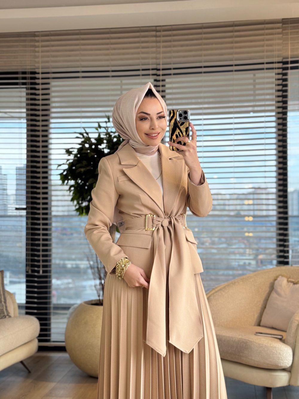 2194-1 İki Düğme Ceket Pilise Etekli Takım Bej