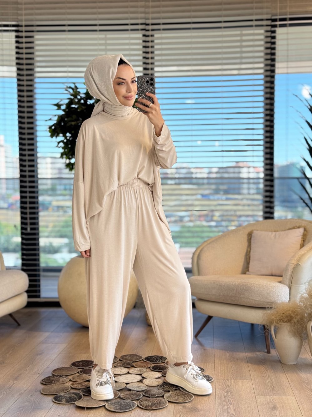 22743 Ön Kısa Arka Uzun Bluzlu Takım Bej