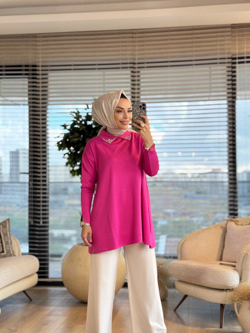 239 Yakası Pırlanta Taşlı Triko Tunik Fuşya
