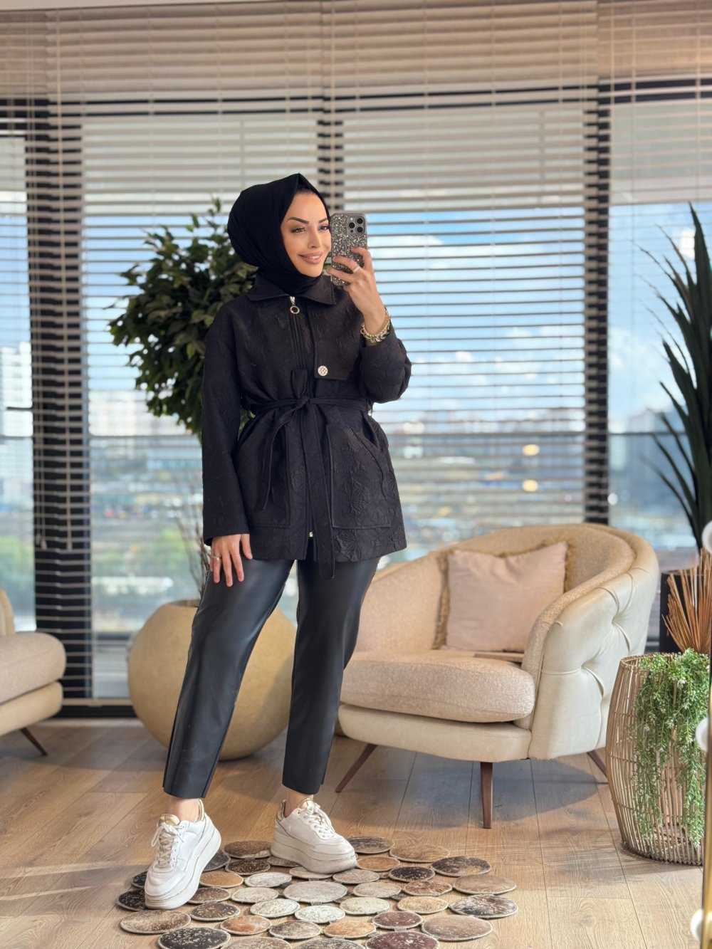 2408 Kendinden Desenli Fermuarlı Ceket Siyah