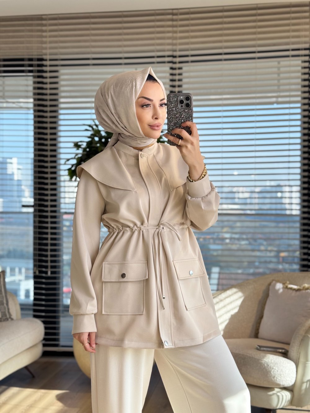 24368 Omuzu Yaka Parçalı Fermuarlı Kap Bej