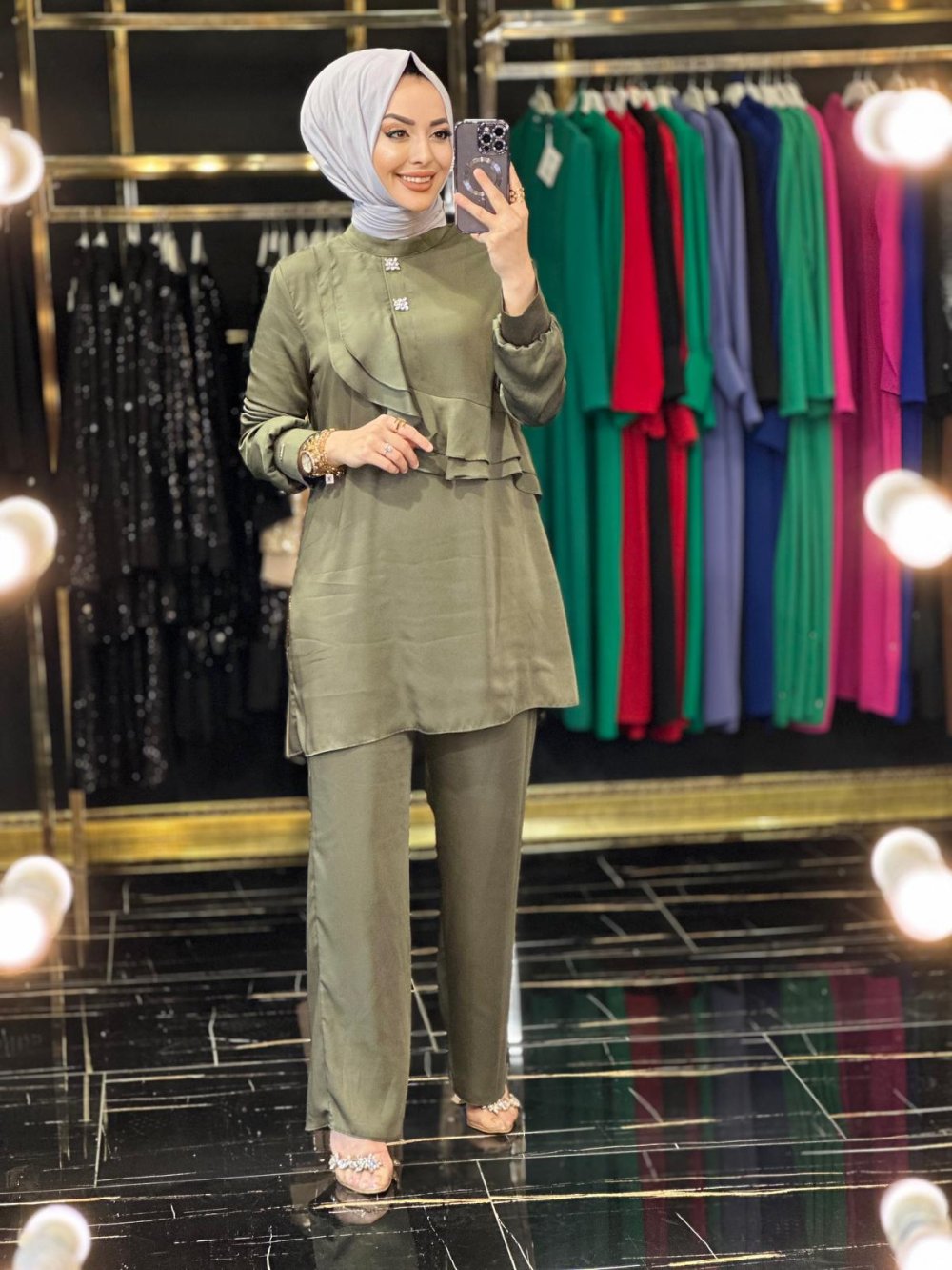 24448 Taş Detaylı Volanlı Takım Haki