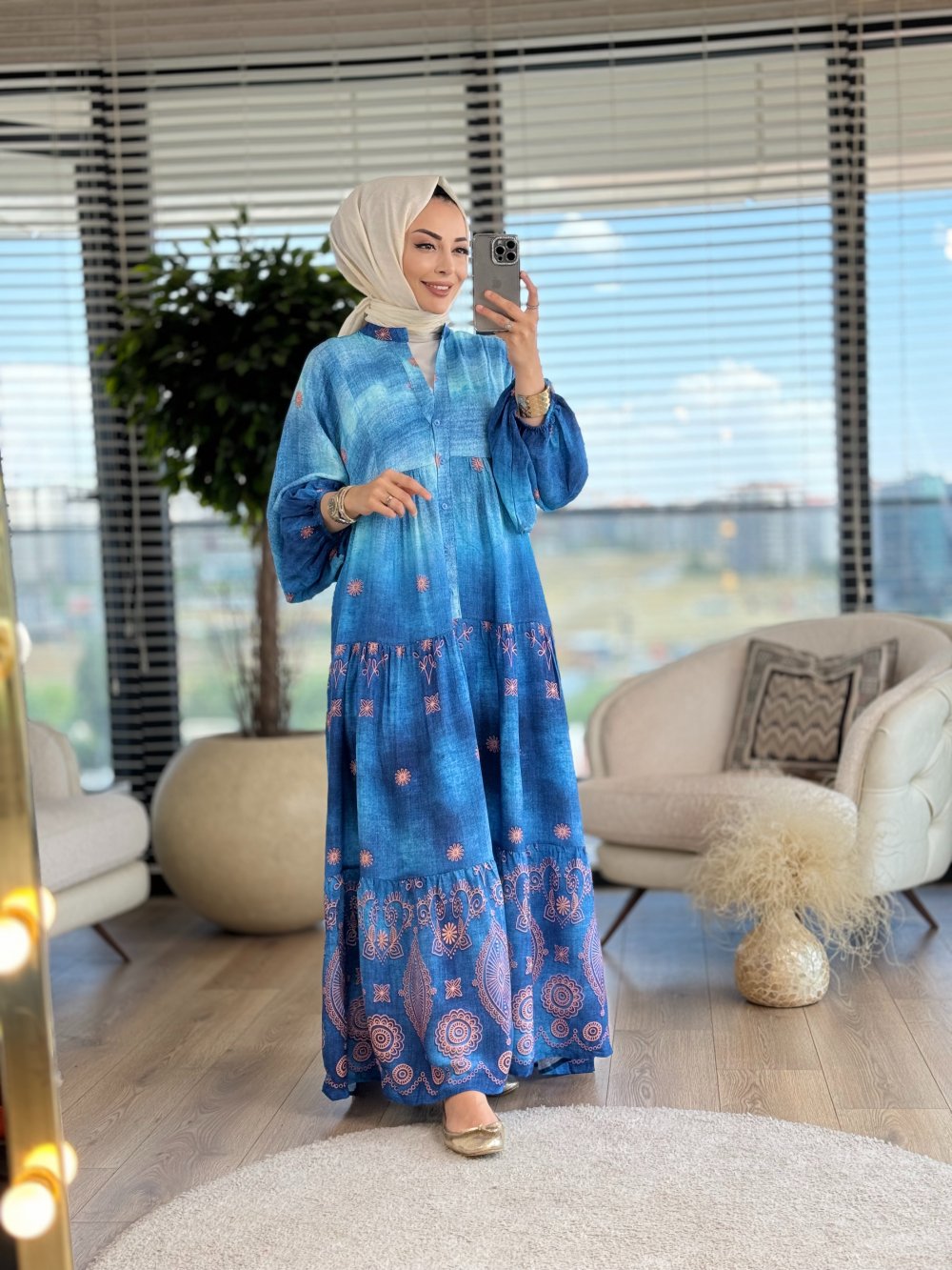 24EL239 Batik Etek Ucu Şal Desen Elbise Lacivert