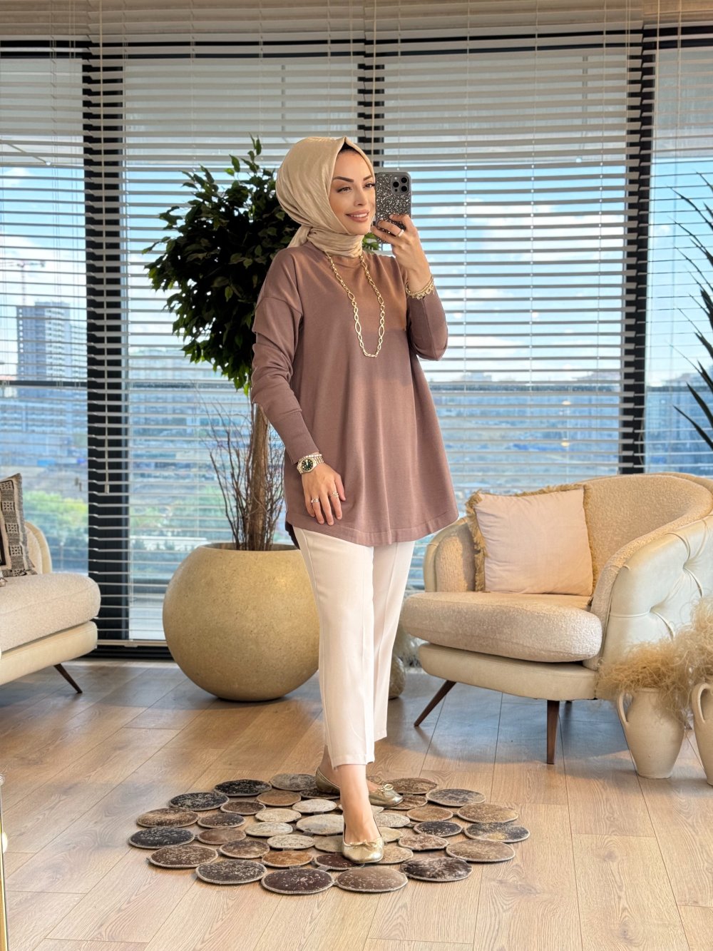 25004 Eteği Oval Sıfır Yaka Triko Tunik Vizon