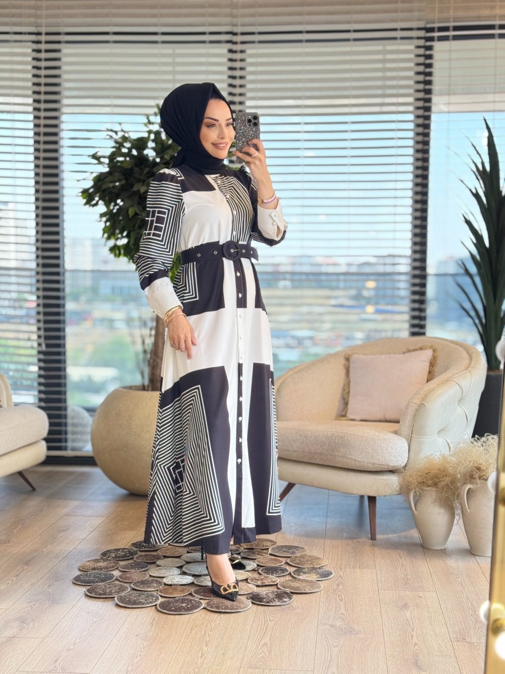 2502 Geometrik Desenli Elbise Siyah