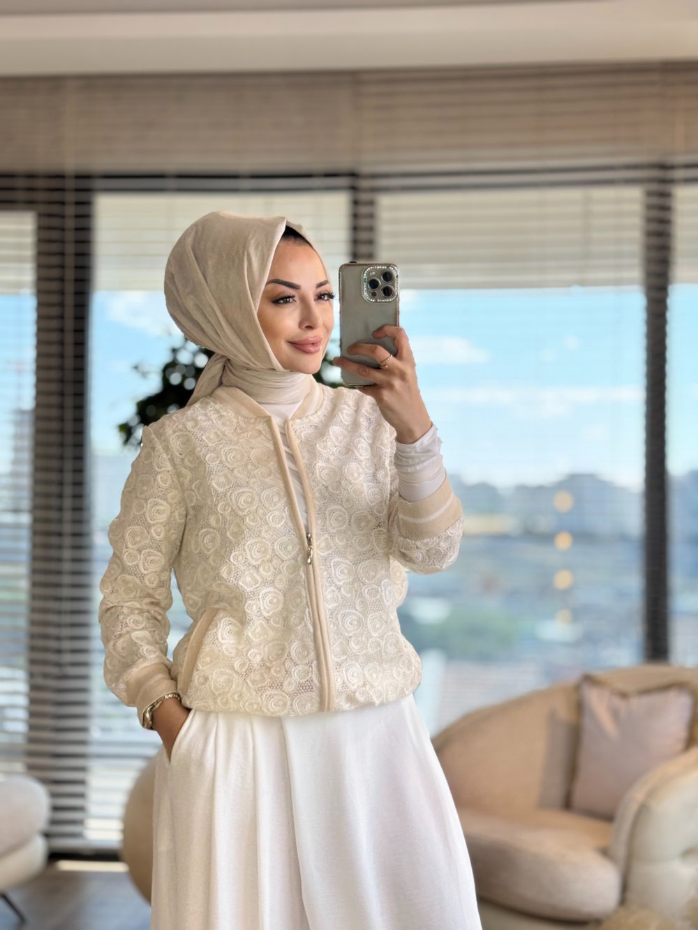 2513-1 Dantel Kordon Nakış Fermuarlı Ceket Bej