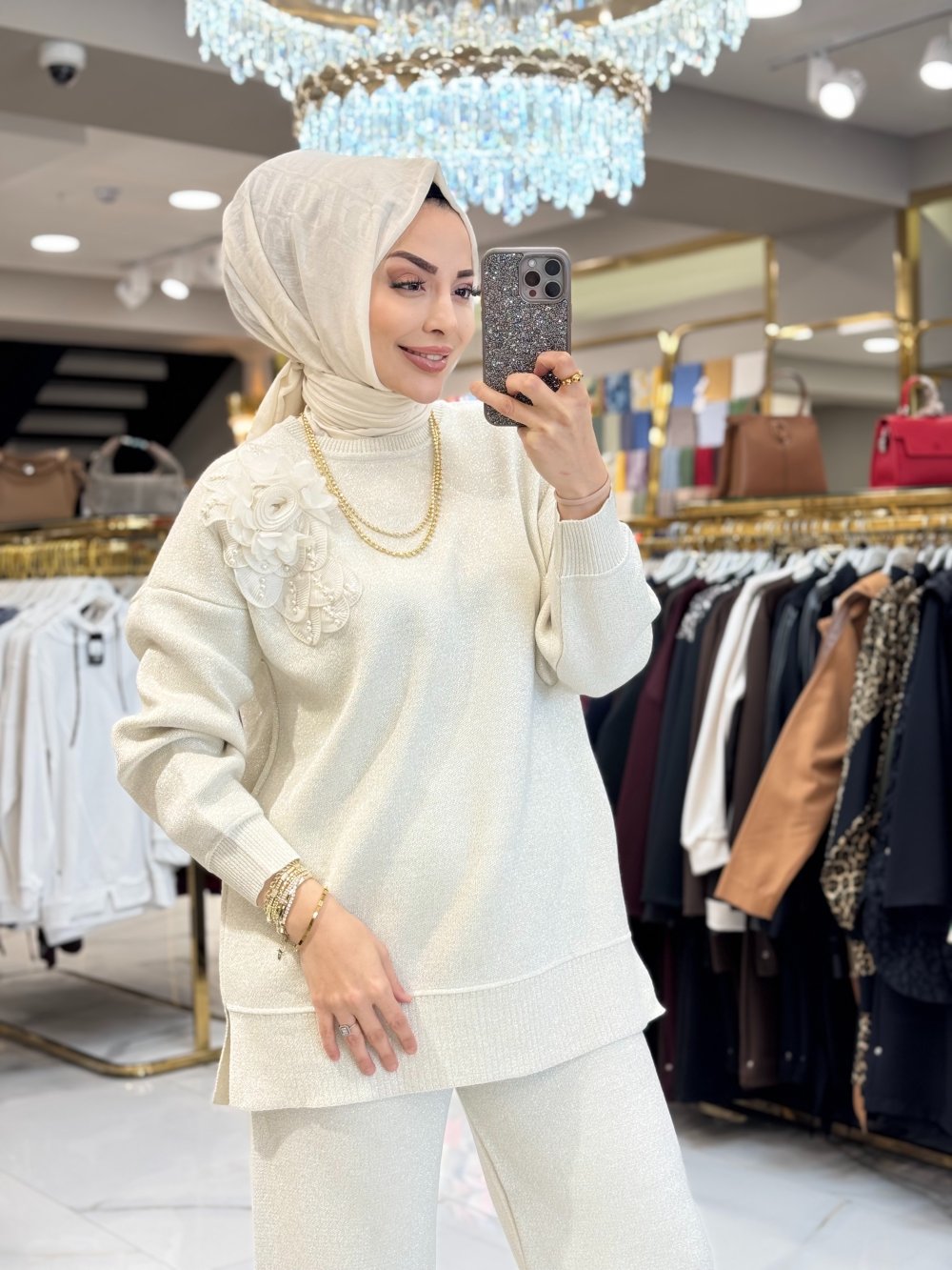 25158 Simli Omuzu Çiçek Broşlu Triko Takım Bej