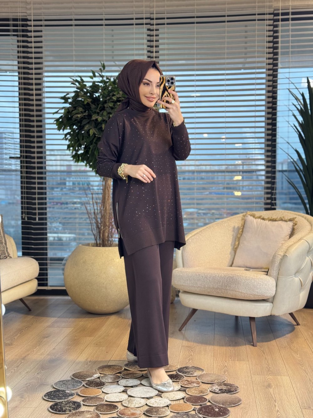 25193 Ön Taş Baskı Yandan Fermuarlı Takım Kahve