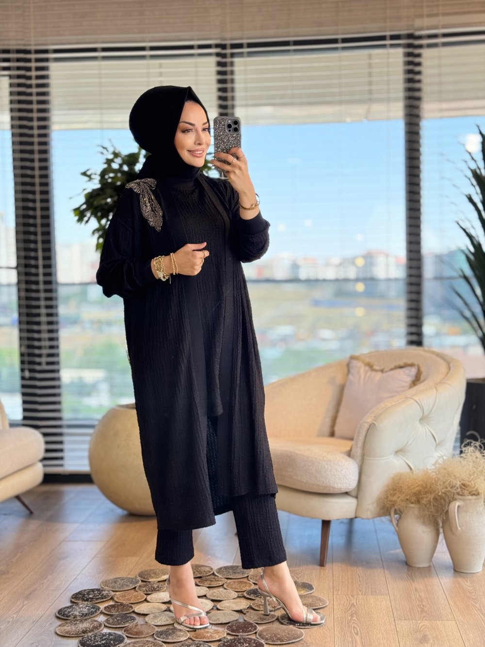 25602 Gofre Sol Omuz Boncuk İşli 3lü Takım Siyah