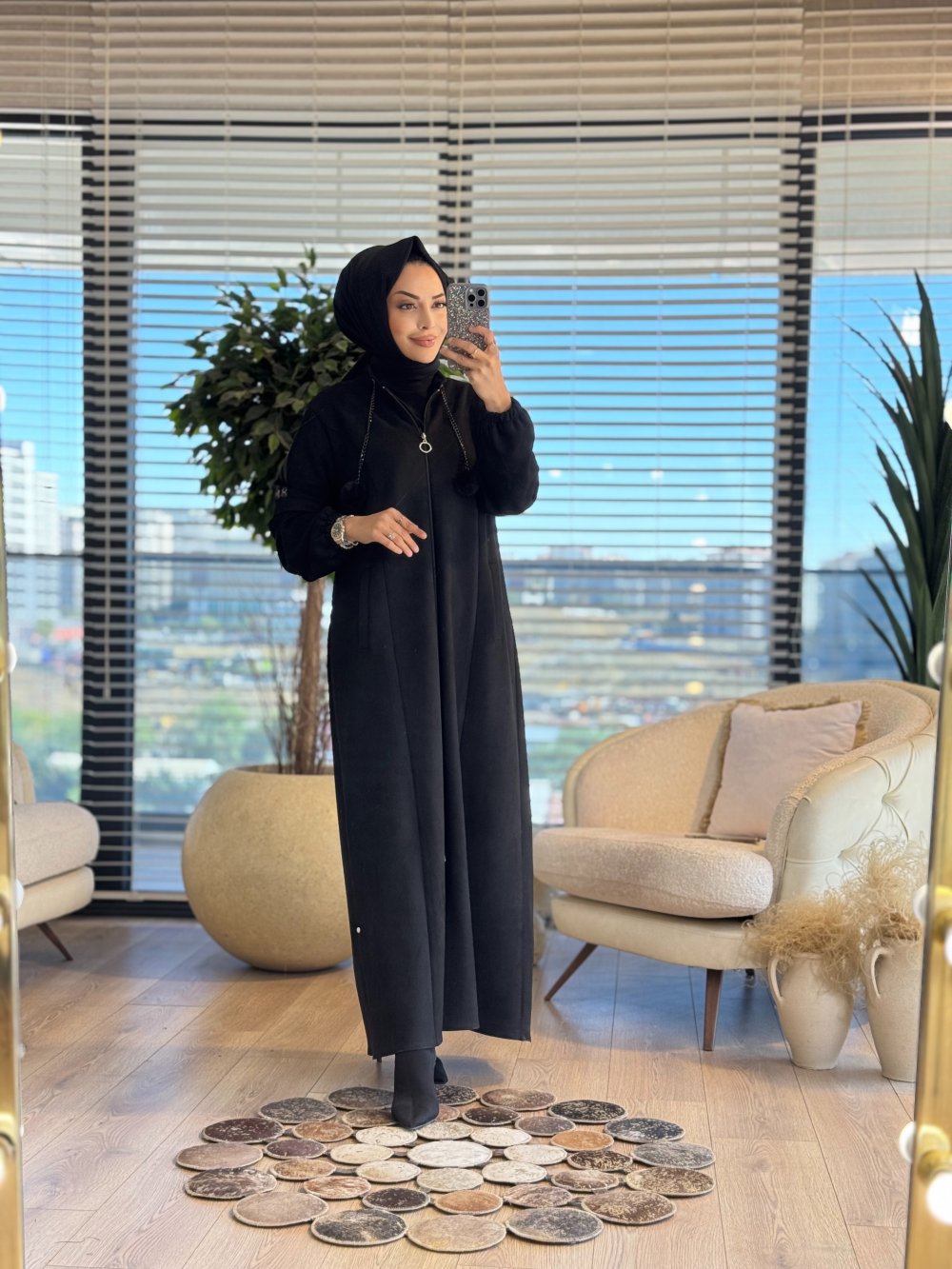 2571 Kolu Şeritli Süet Pardesü Siyah