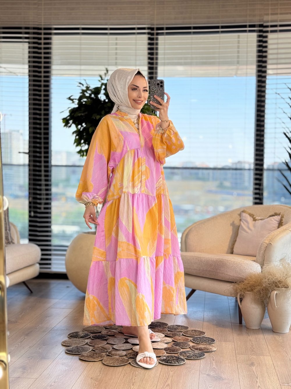 25EL490-1 Batik Desenli V Yaka Elbise Oranj Lila