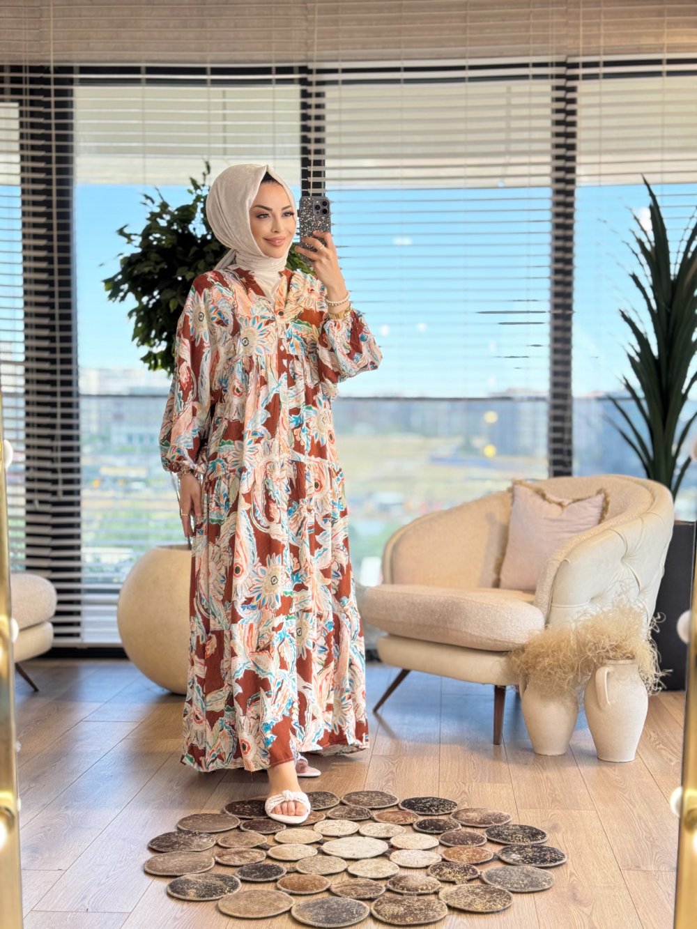 25EL510 Güneş Desenli V Yaka Elbise Kahve