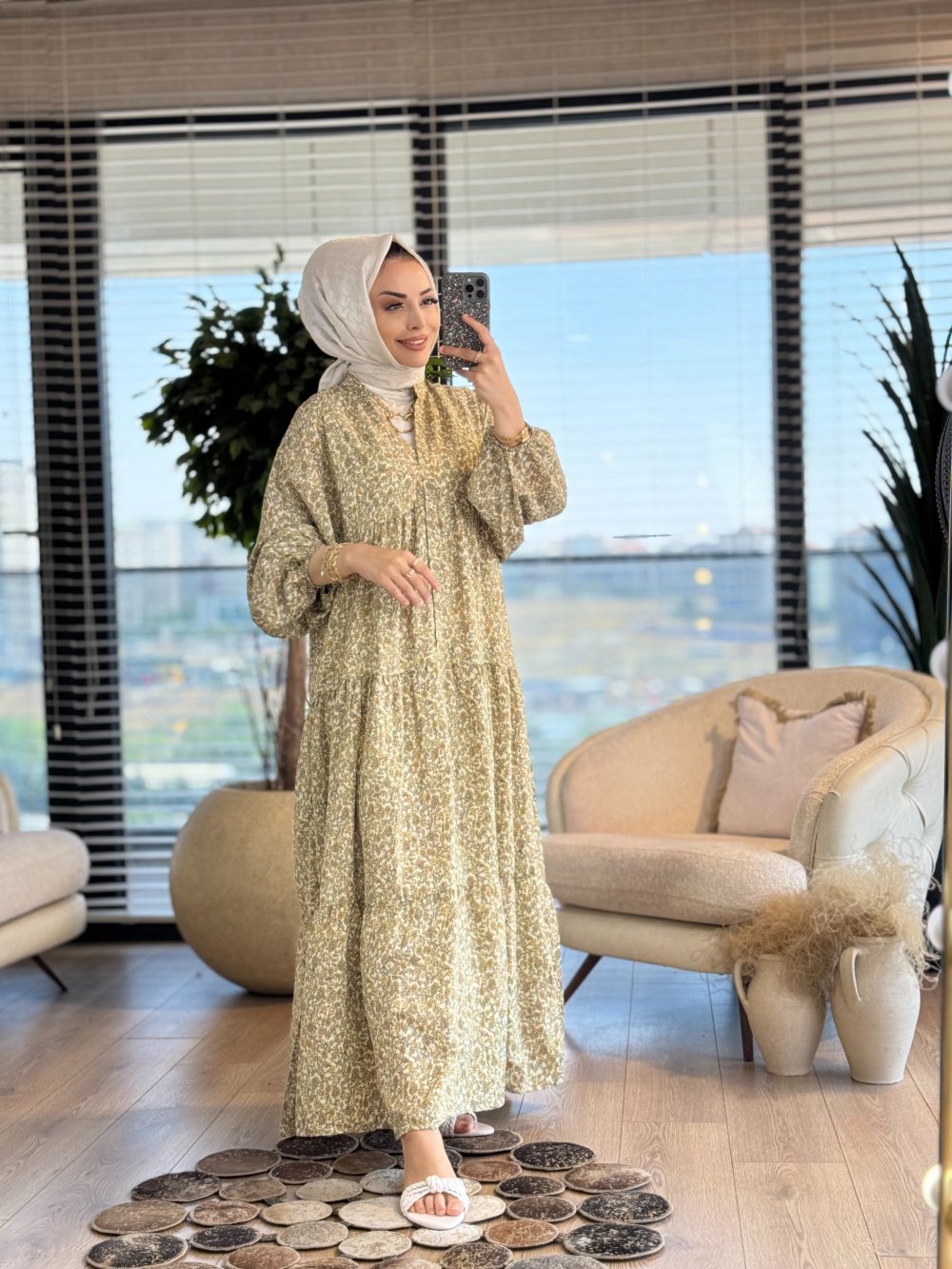 25EL556 Çıtır Çiçekli Elbise Yağ Yeşili
